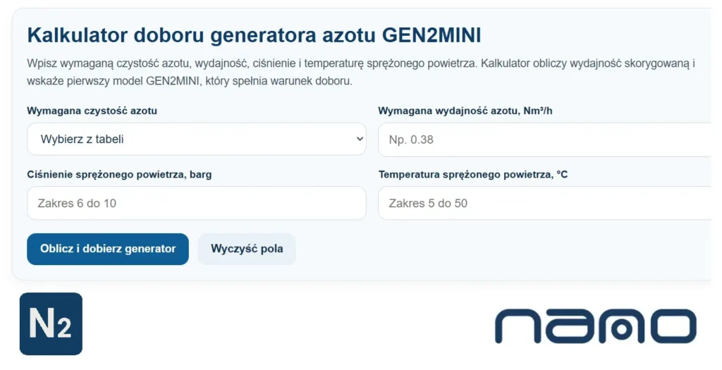 Jeżeli chcesz szybko sprawdzić, jaki generator azotu GEN2MINI pasuje do Twoich warunków pracy, to popatrz na kalkulator poniżej. W kilka chwil dostaniesz wstępny dobór oparty na danych technicznych, a nie na zgadywaniu.